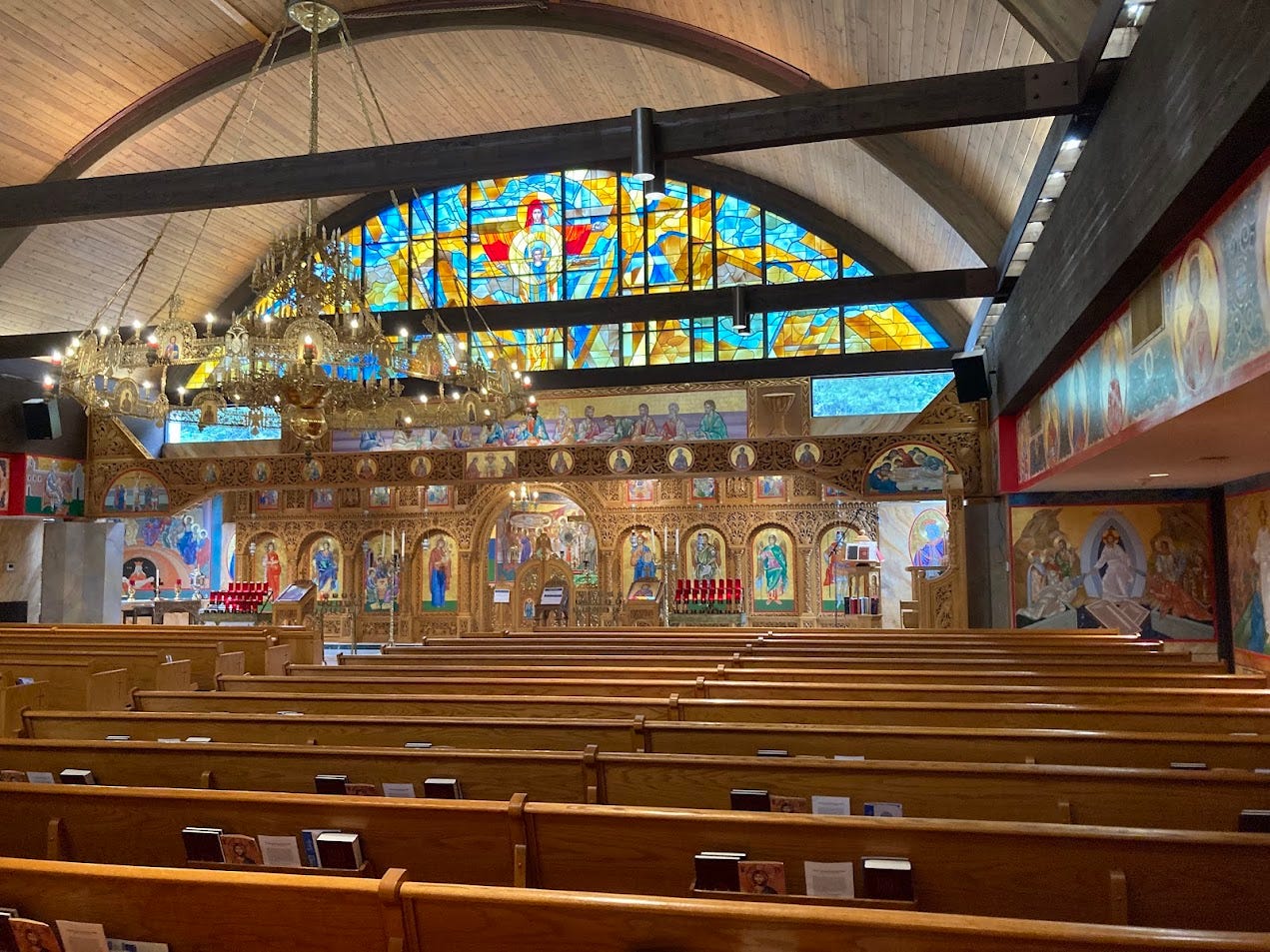 I had a similar feeling recently while visiting a church much closer to home, a Greek Orthodox church built in 19791. While it has the feeling of the late 1970s United States on the outside, on the inside you would think you had been transported hundreds of years into the past and thousands of miles eastward. Unlike even some of those cathedrals, the church is dominated by images, or icons. The eye is almost overwhelmed; it can be hard to know where to fix your gaze. Your attention is drawn to the icons, and whatever may have been occupying your thoughts before you entered is suddenly lost.